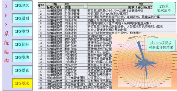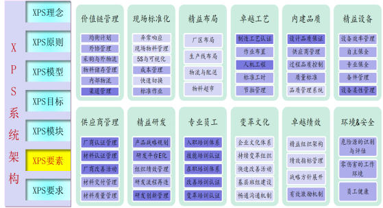XPS持續(xù)變革系統(tǒng)分別從理念,原則,模型、目標(biāo)、模塊、要素。要求等七個(gè)方面進(jìn)行規(guī)劃和建模。既有深度,又有廣度,同時(shí),建立評價(jià)要素和實(shí)施要求,也達(dá)到了集團(tuán)戰(zhàn)略要求迅速推進(jìn)精益變革的戰(zhàn)略要求。
